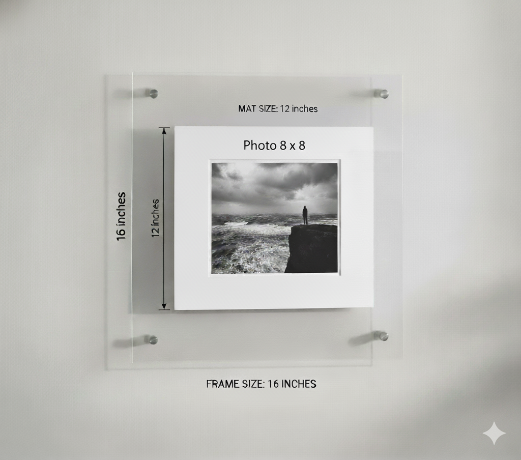 The final frame will be 8" LARGER than your artwork as both the mat and the frame add extra width and height.